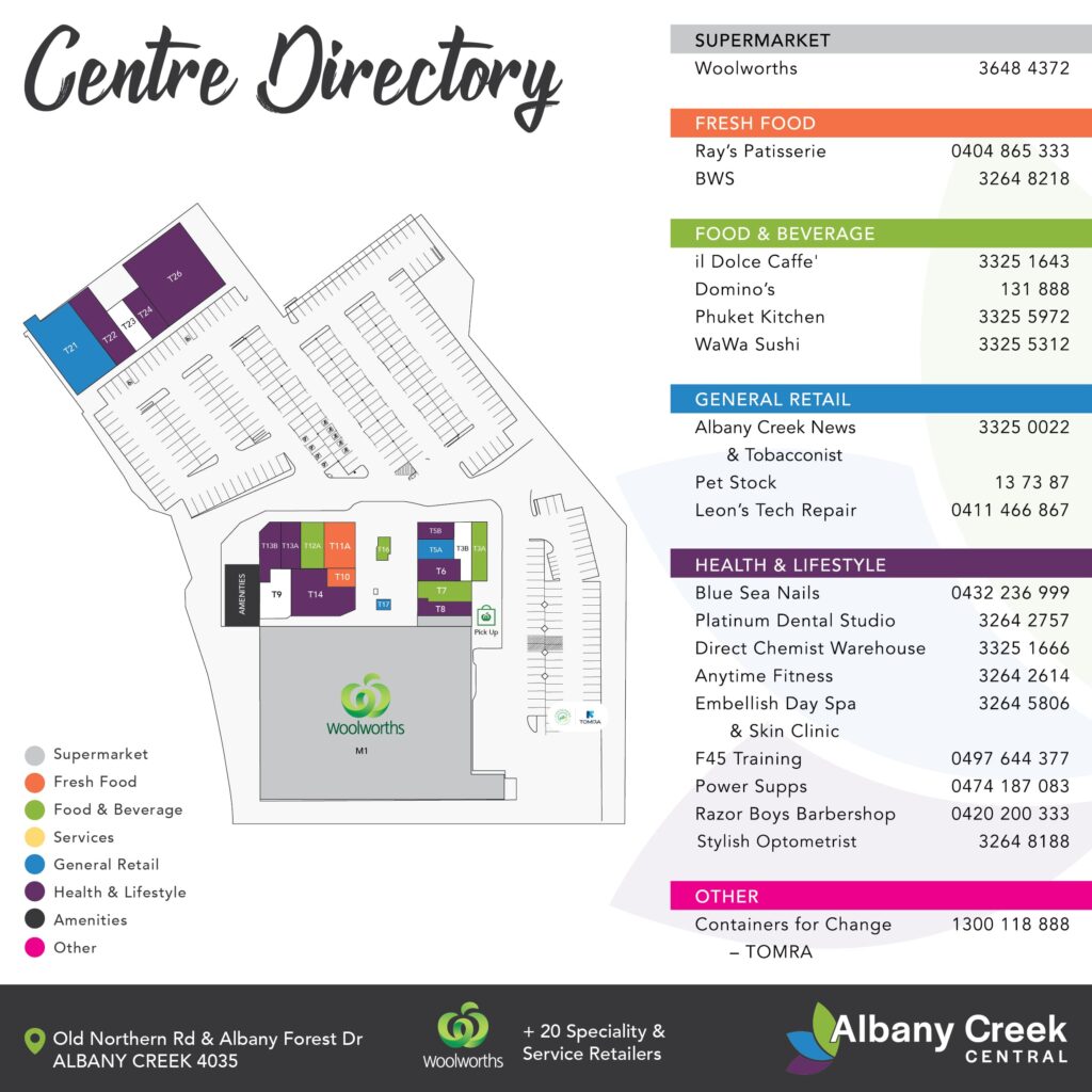 Albany Creek Central Shopping Centre has had a facelift with a new look air-conditioned enclosed shopping mall. Also, Woolworths Supermarket has been refurbished with new Fresh Fruit, Deli and Bakery sections. The Shopping Centre also offers a variety of fresh & fast food options plus a number of retail and lifestyle services, including a Day Spa and Skin Clinic, Optometrist and Allied Health Centre.